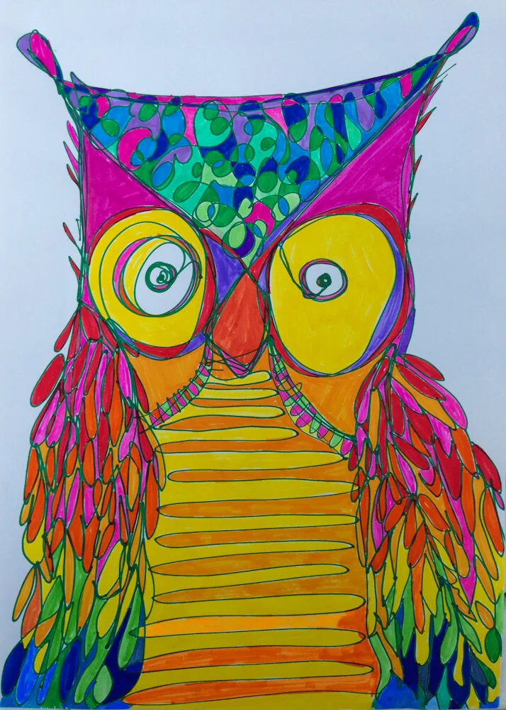 Your little ones will be guided through the process of owl drawing and media choices to color their beautiful fall owl.